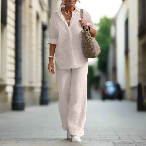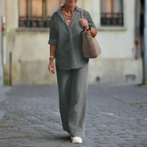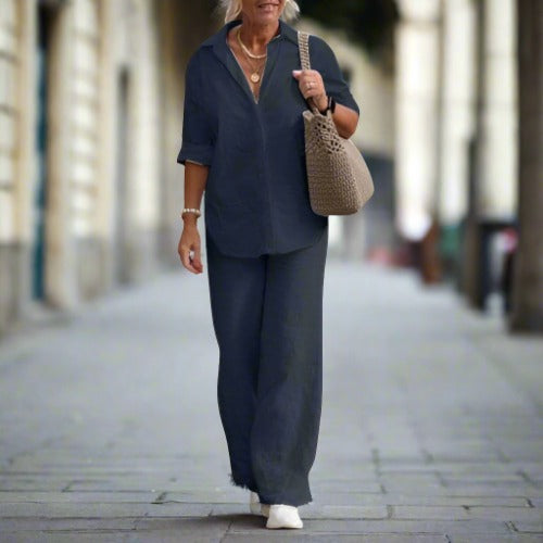 Dieses zeitlose Ensemble kombiniert mühelos Stil und Komfort und ist die perfekte Wahl für jede Gelegenheit. Ob für einen entspannten Tag in der Stadt oder eine elegante Abendveranstaltung – mit diesem vielseitigen Set sind Sie immer bestens gekleidet.